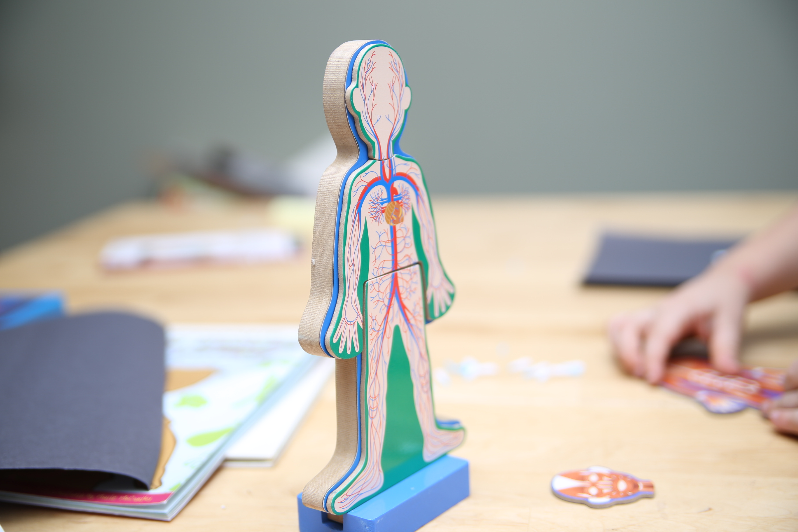 I bought the Melissa & Doug Magnetic Human Body model from Amazon. I liked that it had both male and female models as well as models that showed the muscle, circulatory, organ and bone systems. We laid the model down at the end and stacked all the systems to show them how many things our bodies could do at once. They had a blast making all the systems and we played a fun matching game with it.