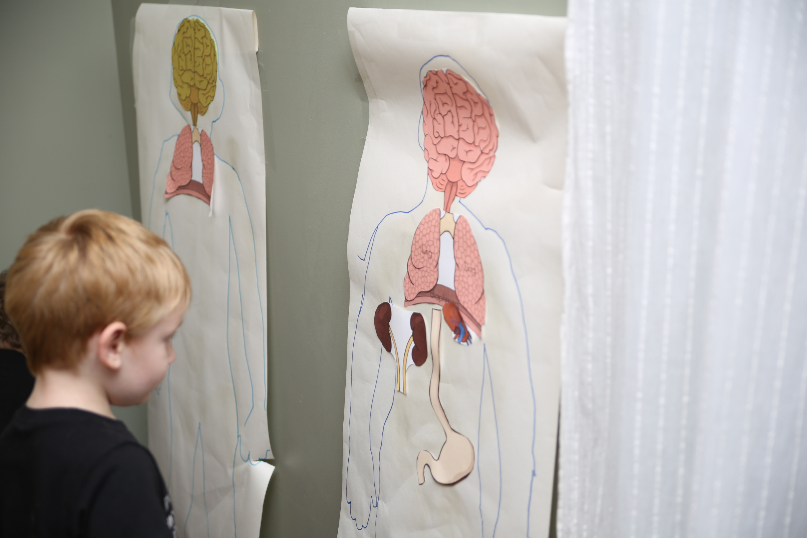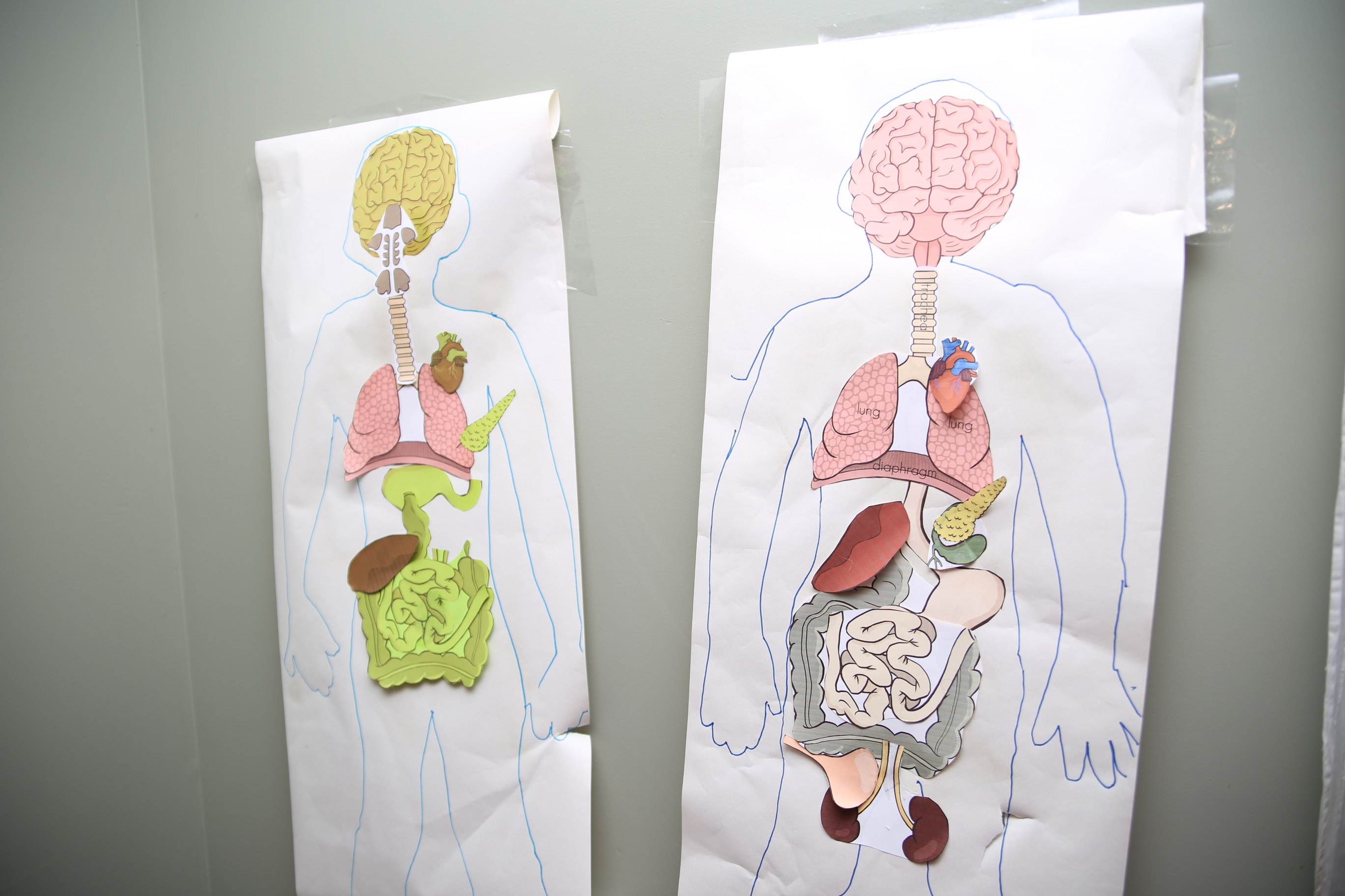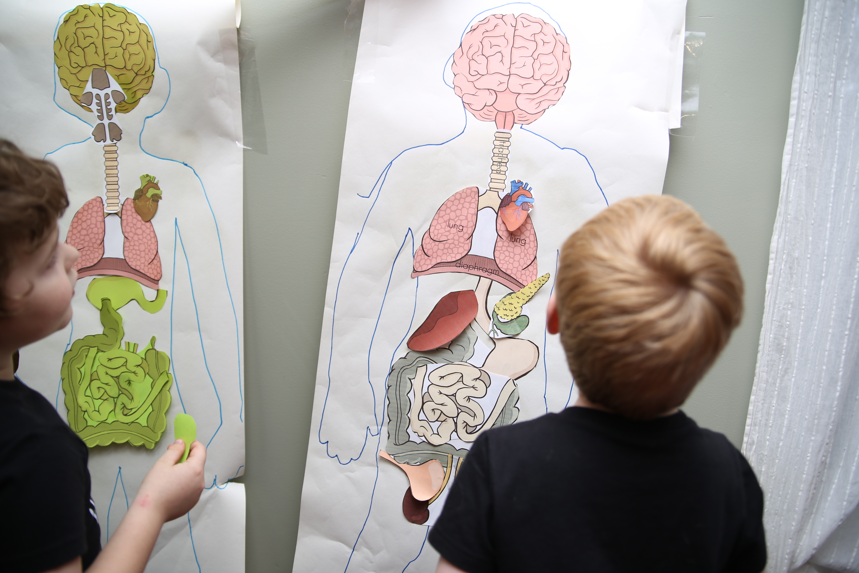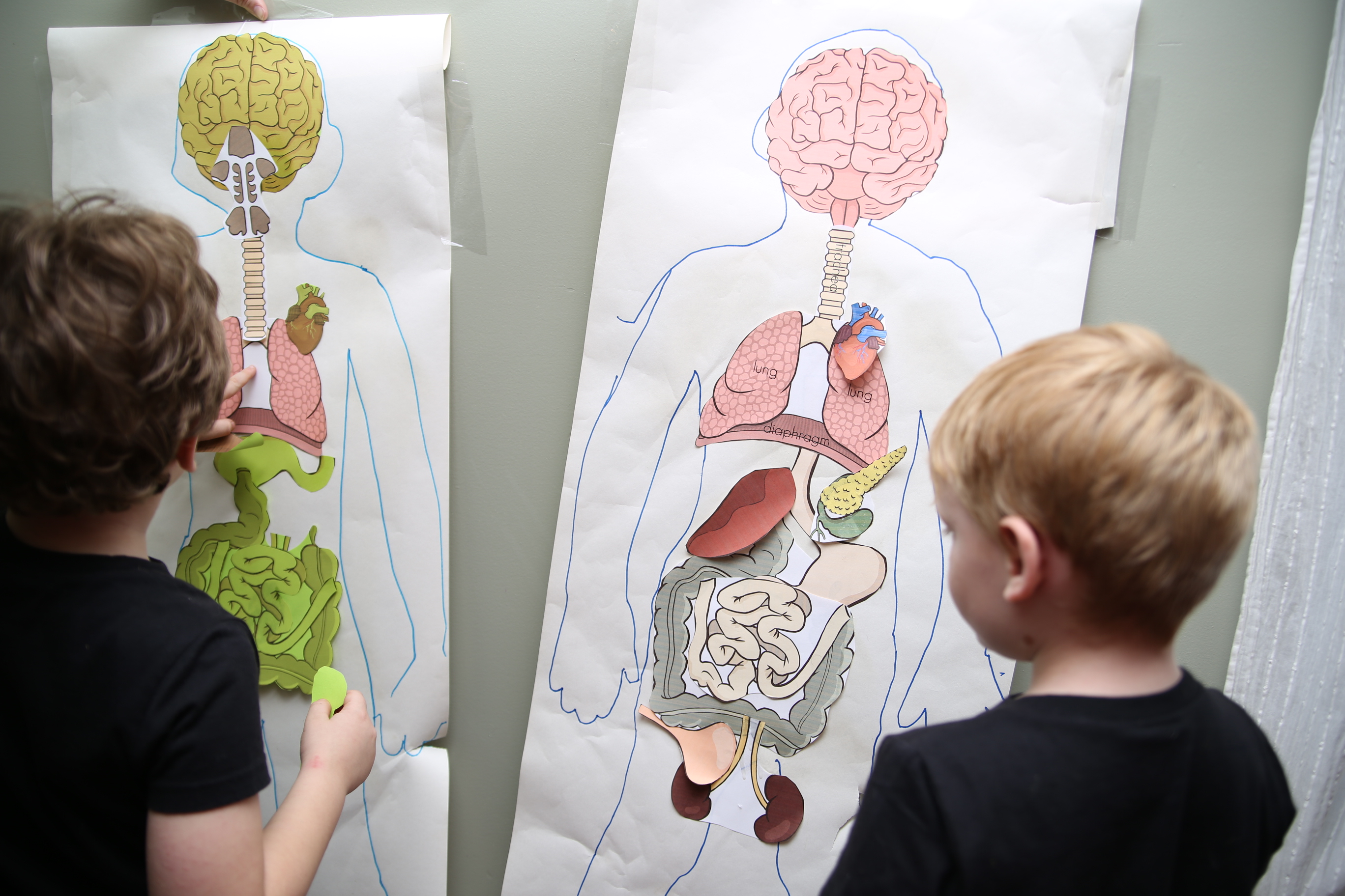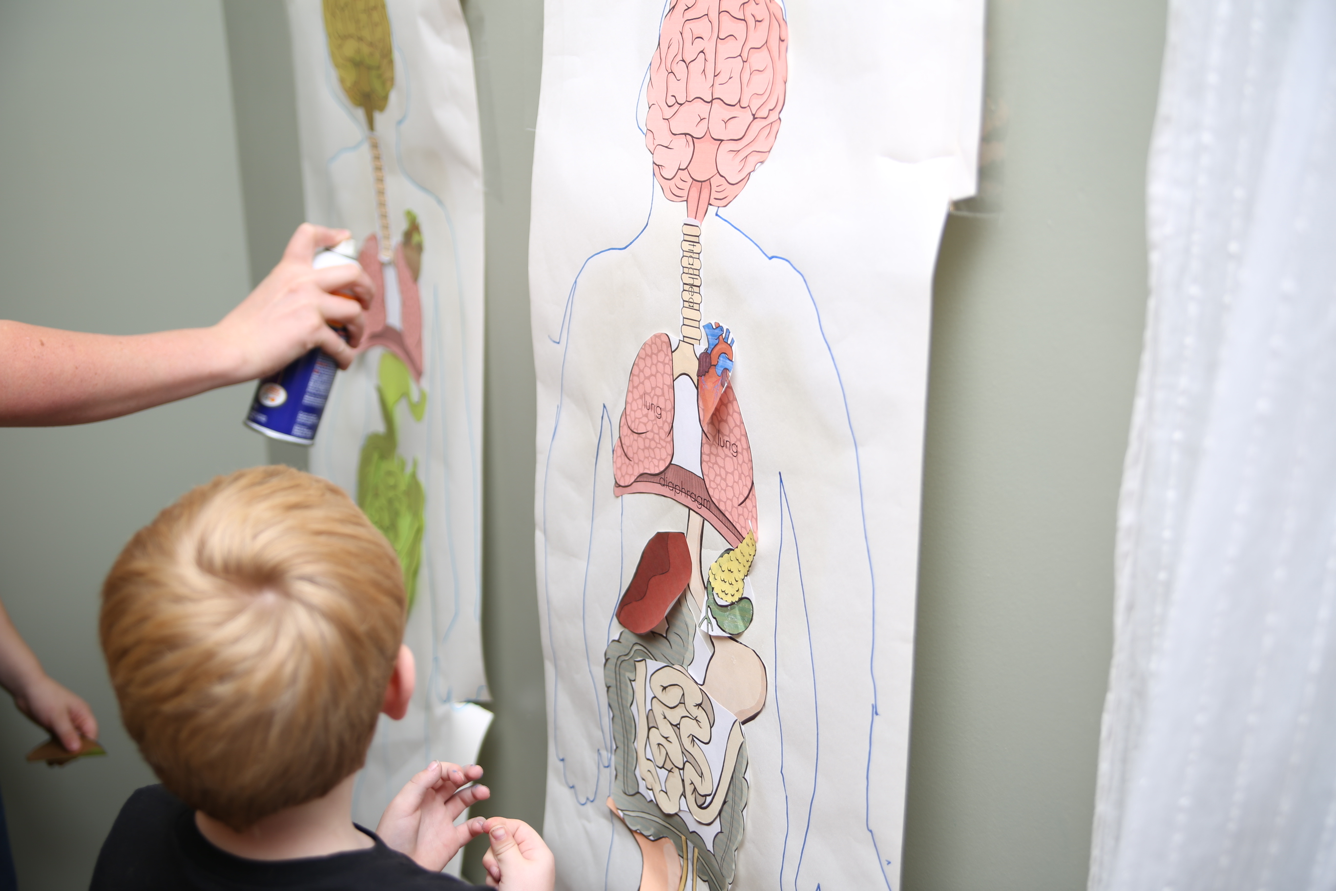 The first thing we actually had the kiddos do was lay down on butcher paper and we traced their bodies. Then we rolled it up and saved it as a fun surprise at the end. After we finished our other activities, I brought it back out and hung them on the wall. We cut out the free life size body part printouts from Adventure In A Box, and the boys got to put them on their body tracing. I used Elmer’s Craft Bond Spray Adhesive, because it lets you move around pieces easily before firmly adhering to the paper without making a huge mess. I think this was a great way to end the lesson, because it really helped tie in the parts that are actually inside them. It was really neat watching them name the organs and try to remember where they went!