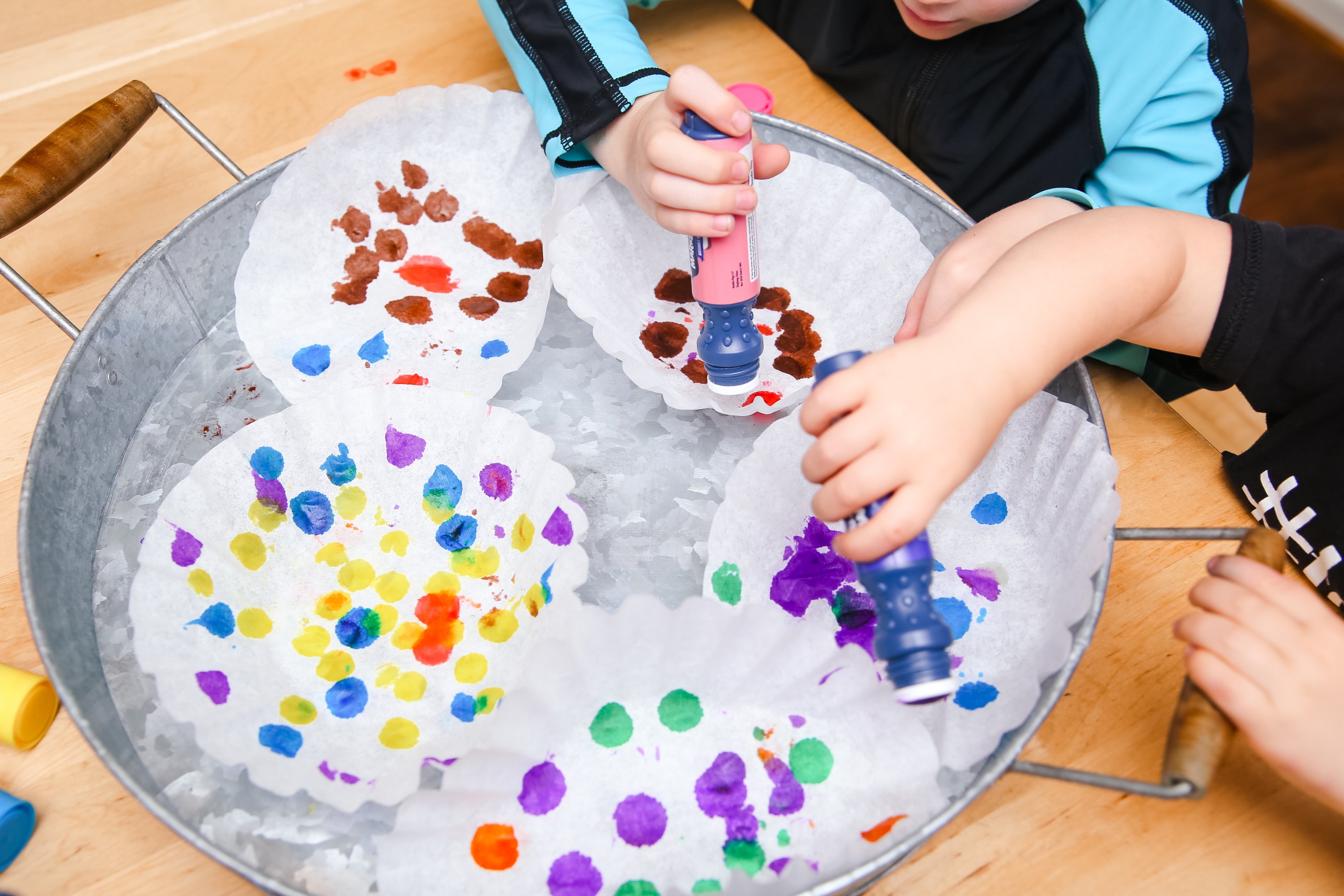 Color mixing is an easy way to help kids learn primary and secondary colors and work on fine motor skills.