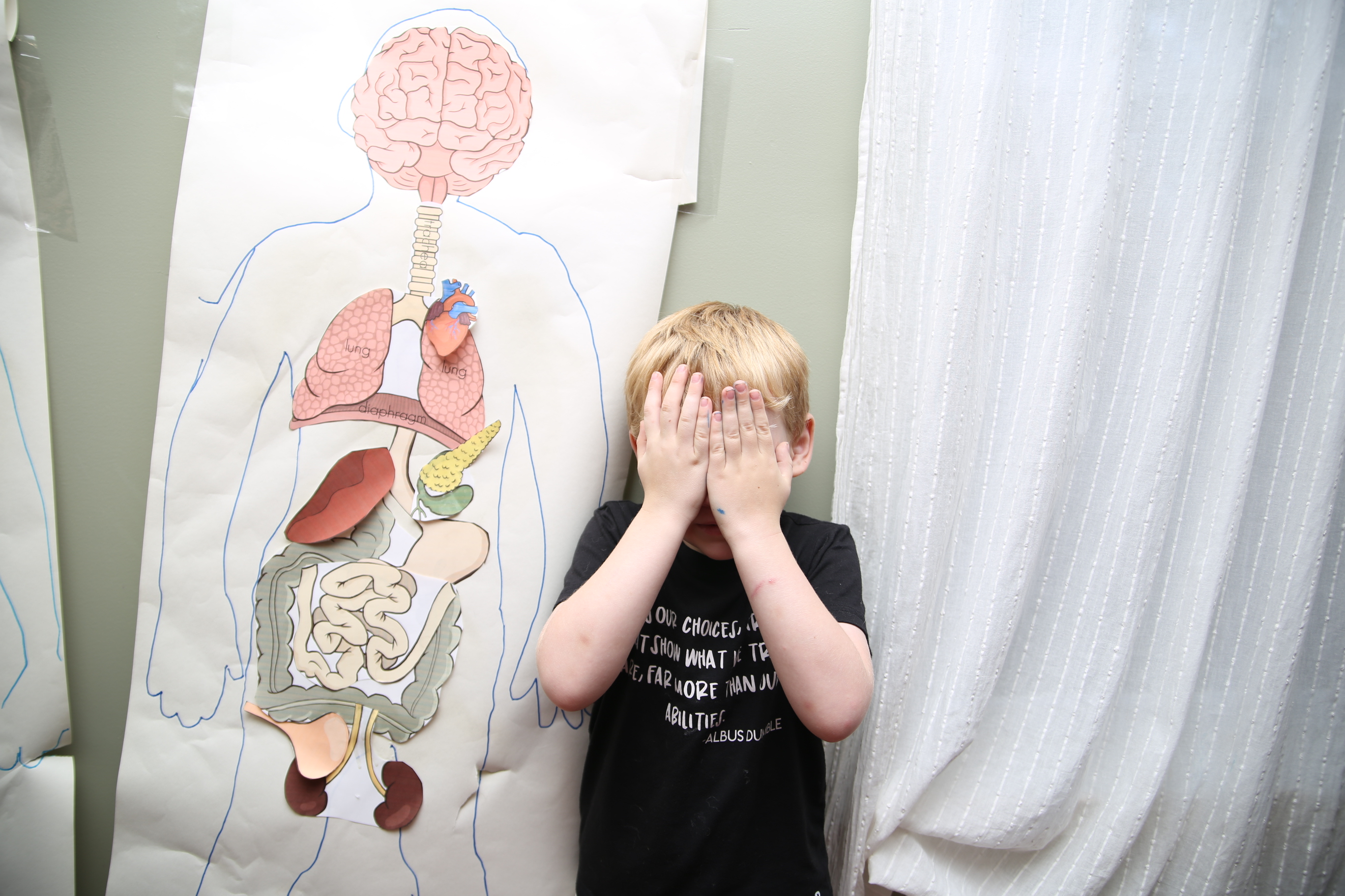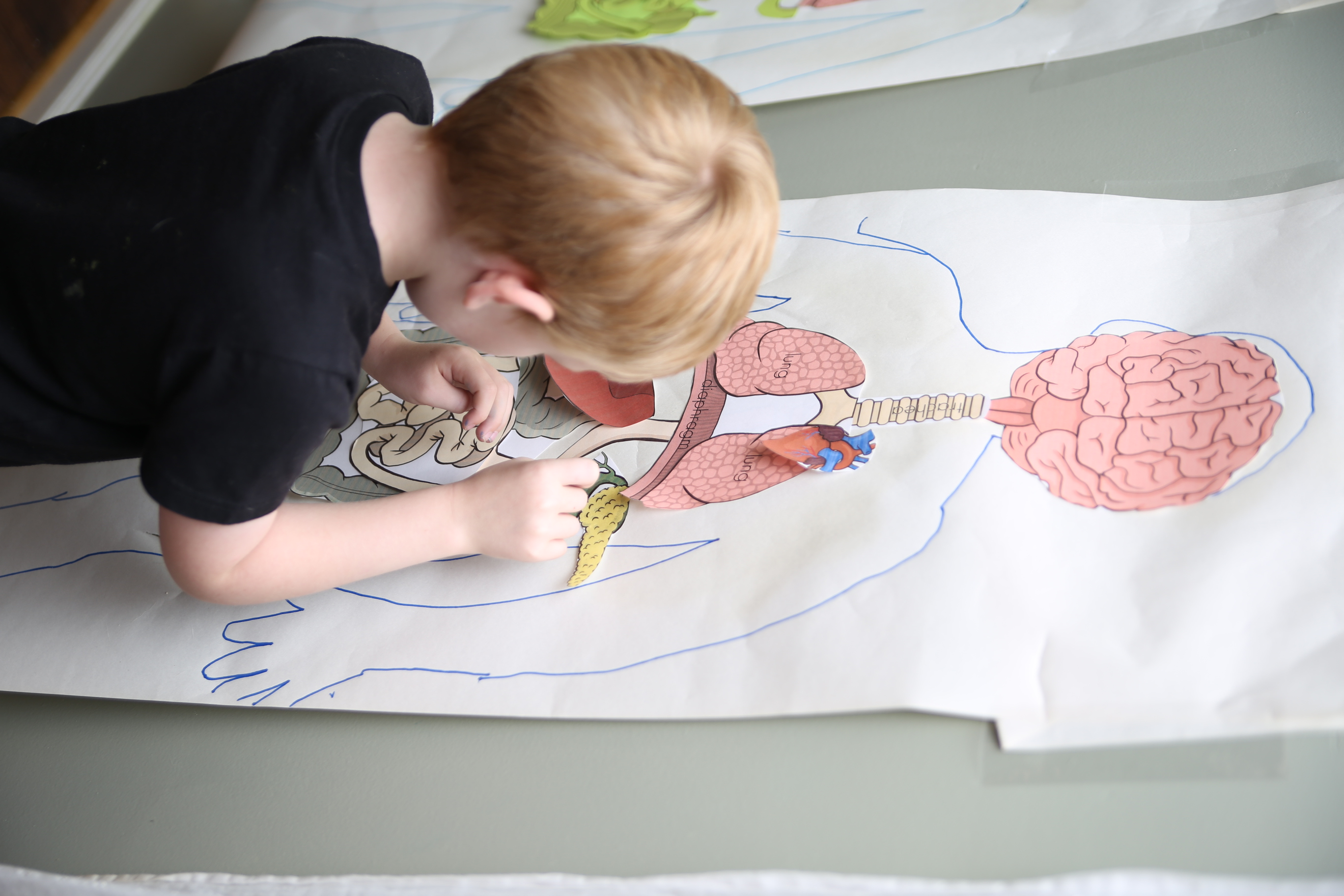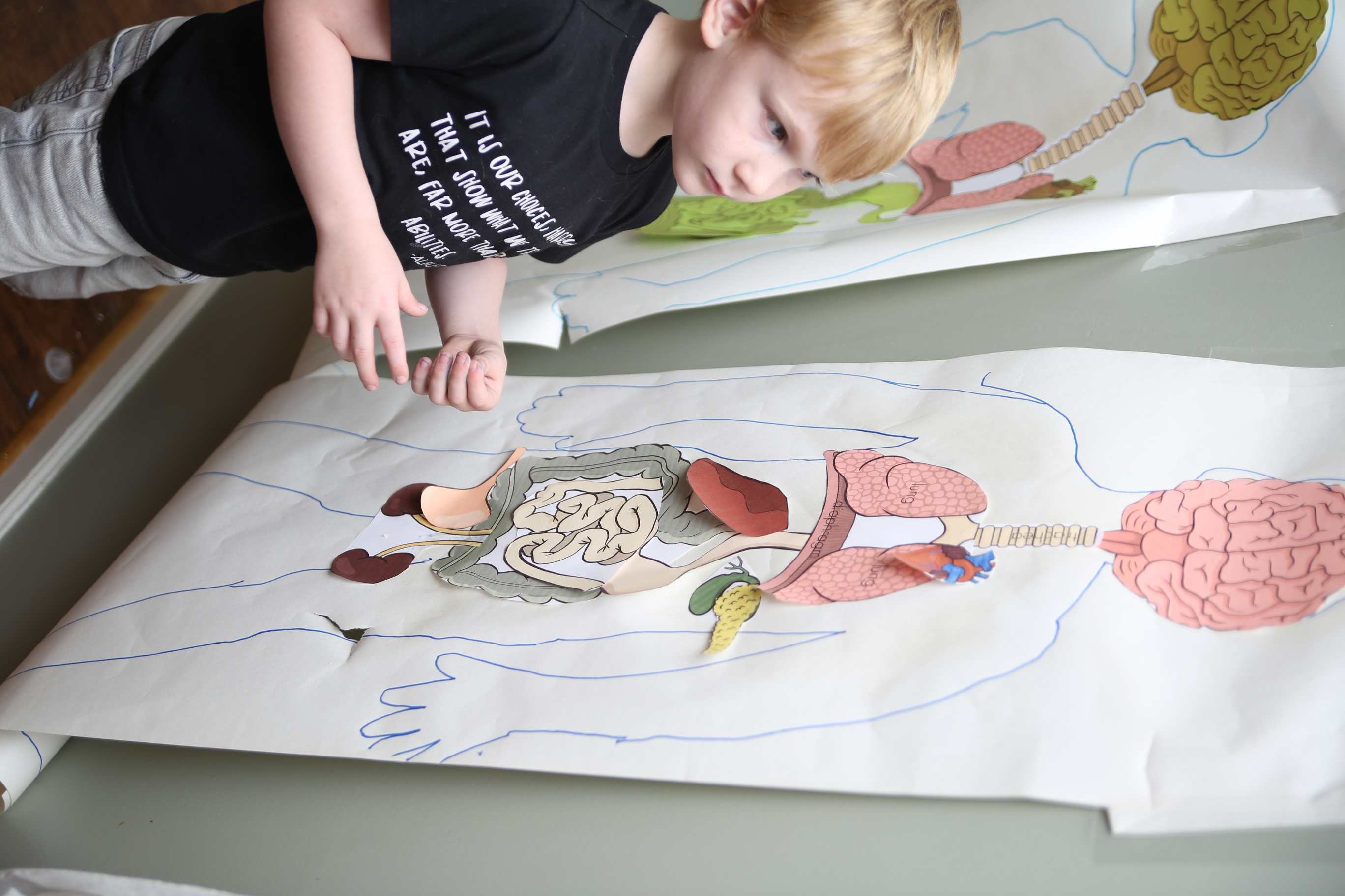 The first thing we actually had the kiddos do was lay down on butcher paper and we traced their bodies. Then we rolled it up and saved it as a fun surprise at the end. After we finished our other activities, I brought it back out and hung them on the wall. We cut out the free life size body part printouts from Adventure In A Box, and the boys got to put them on their body tracing. I used Elmer’s Craft Bond Spray Adhesive, because it lets you move around pieces easily before firmly adhering to the paper without making a huge mess. I think this was a great way to end the lesson, because it really helped tie in the parts that are actually inside them. It was really neat watching them name the organs and try to remember where they went!