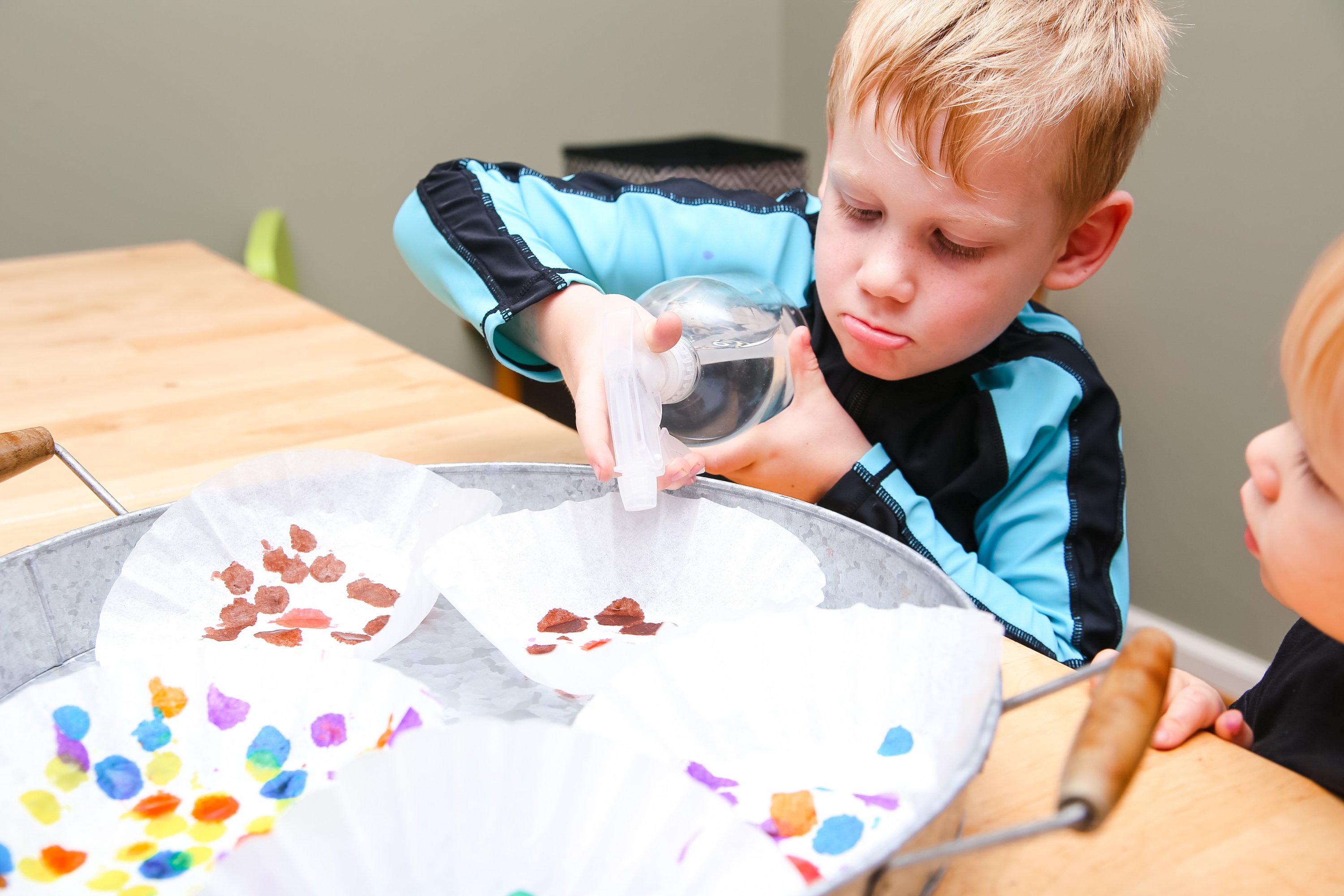 Start off with drawing a single circle around the base of the filter. You can either fold it 4 times and place the colored tip in shot glass or use a water bottle and spray the colored center. Both methods work well, I opted for the spray bottle because Finn was joining us and having that many glass shot glasses with 2 small children was a dicey idea.